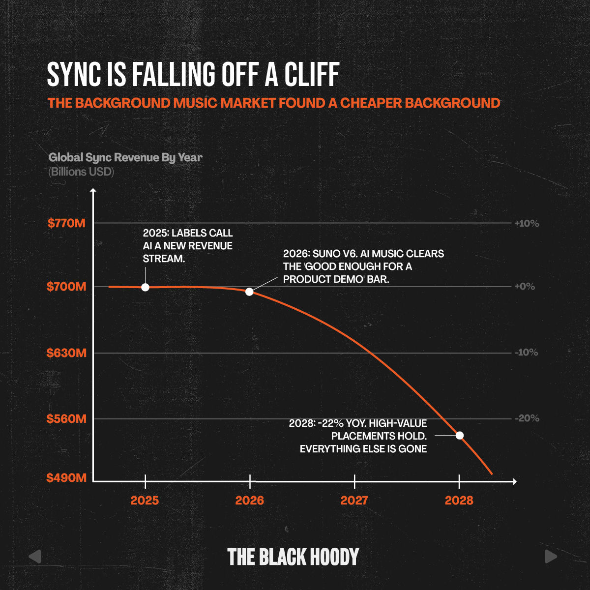 Global sync revenues had already declined 2% in 2025, from $700 million to $641 million. By 2028, the decline accelerated to 22% year on year. High value placements in major films and premium television held up. Everything else cratered.