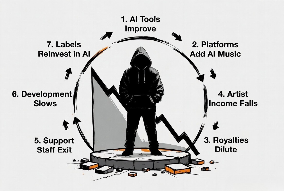 AI music tools improved. Streaming platforms integrated AI-generated content. The royalty pool diluted. Artist income fell. Managers and support staff left the profession. Artist development slowed. Labels cut headcount and redirected savings to AI tools. AI music tools improved.