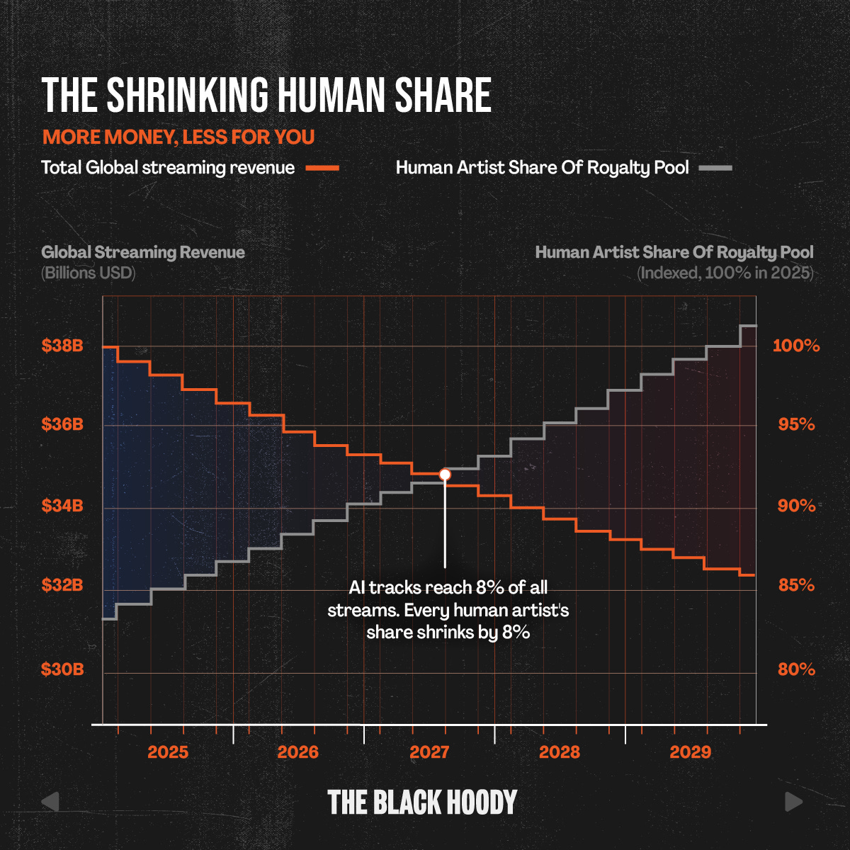 The independent artist who was making $390,000 a year in 2025 was now making $310,000. Still a living, yes. But the artist below them, the one making $80,000, was now making $64,000. And the one below them, the songwriter making $30,000, was now at $24,000. The margins were already thin. AI did not break a system that was already broken. It broke a system that was finally starting to work.